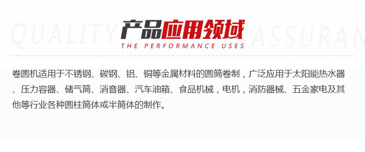 卷圆机:适用于不锈钢、碳钢、铝、铜等金属材料的圆筒卷制,广泛应用于太阳能热水器、压力容器、储气筒、消音器、汽车油箱、食品机械,电机,消防器械、五金家电及其他等行业各种圆柱筒体或半筒体的制作。